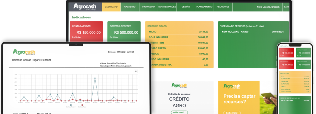 Agrocash é um software online que permite que você centralize e otimize todas as informações da sua propriedade como controle patrimonial, financeiro e de estoques. Gestão das lavouras, planejamento financeiro e uma ampla variedade de relatórios tornam o software completo.